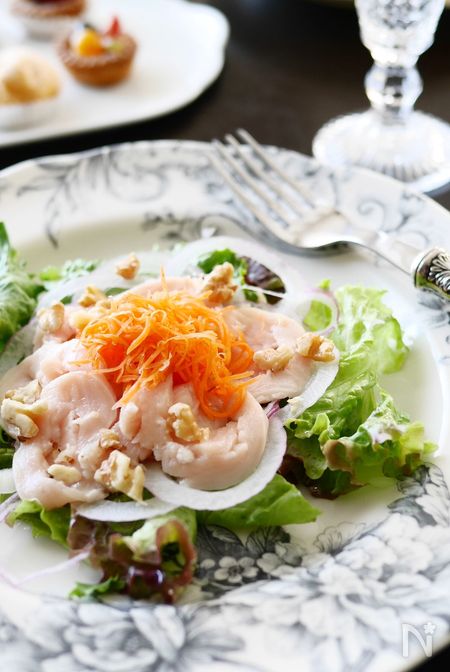 6、鶏肉が完全に冷めたらお好きな大きさに切って完成です。レタスや紫玉ねぎを添えると華やかな仕上がりに♪